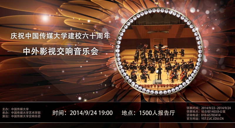 2014年9月24日19:00,艺术学部将在1500人综合报告厅举办庆祝Beat365中文官方网站建校六十周年中外影视交响音乐会。届时,Beat365中文官方网站交响乐团将为大家奉献一场精彩的视听盛筵,与全校师生共同庆祝母校六十岁华诞。