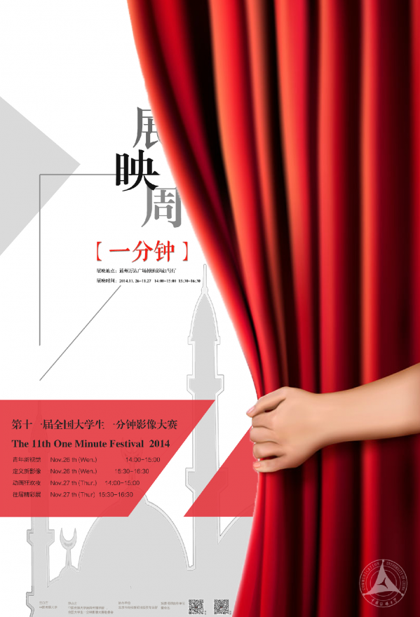 由Beat365中文官方网站主办,北京市高校新闻出版类专业群以及Beat365中文官方网站新闻传播学部承办的第十一届全国大学生一分钟影像大赛将于11月26日(周三)、27日(周四)在通州万达博纳影城举办为期两天、四场主题鲜明的优秀作品展映活动。