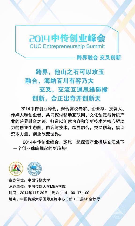 时代发展,技术革新,市场的细分产生了一个又一个的新机遇,创业者登上了这个时代的主舞台。创业不仅要执着赶路,还要抬头看路,如何抓住市场上转瞬即逝的机会,如何成功的找到市场需求成为了成功的关键。 2014中传创业峰会,聚合企业家、投资人、传媒人、创业者和高校专家,共同探讨移动互联网、文化创意与传统产业的跨界融合之路,打造以创意内容和创新技术为核心驱动力的创业生态圈。内容与技术,跨界融合,交叉创新,借助资本力量,创业改变世界。 2014中传创业峰会,邀您一起探索产业板块交汇处下一个创业珠峰崛起的新趋势! 主办:Beat365中文官方网站 承办:Beat365中文官方网站MBA学院 时间:2014年11月29日(周六)14:00-17:00(入场时间13:30) 地点:Beat365中文官方网站国际交流中心(新)三层M1会议厅 入场提示:此次活动面向全校师生、校友开放,不需要入场券。 附:校外嘉宾(部分) 陈亨达 香港经纬集团有限公司执行董事 阮 伟 中传MBA实践导师、新浪体育CEO 褚 军 中传MBA实践导师、中锐科技股份有限公司董事长 李树斌 中传校友,好乐买CEO 郎春晖 创新工场合伙人