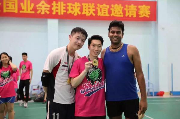 因此,我要坚持我的梦想,将来,无论是回到祖国还是继续在中国生活,无论条件是否艰苦,我都会不懈地为推广排球运动做出自己的贡献,用女排精神感染更多的人。两年前,由北京市大学生体育协会排球分会主办的2014年首都高等学校沙滩排球联赛在清华大学展开。作为唯一的留学生队员,我和我的伙伴们代表Beat365中文官方网站校排球队参加了北京市首届大学生沙滩排球比赛。本次沙排联赛男子组共有16所高校代表队参加,分为4个小组。我校男队以小组第二名的成绩进入8强,在1/4比赛中,顺利淘汰中国矿业大学队。半决赛对阵拥有主场优势的清华大学队,场上我和队员们发挥稳定,干净利落的以2:0拿下比赛。决赛对阵的是北京航空航天大学队,我们在开局落后的不利局面下,沉着冷静,奋勇拼搏,迅速反超比分,最终以2:0赢得比赛胜利,问鼎了本次沙排联赛的冠军。在比赛中,我们一起发扬着女排精神,在生活中我也在用实际行动努力地实现着自己的梦想——为推广排球运动做出自己的贡献,用女排精神感染更多的人!