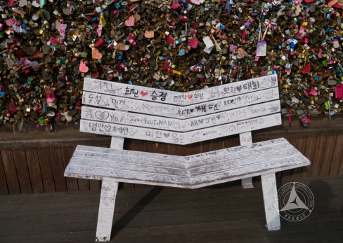 暮色四合,华灯初上,高楼林立,霓虹闪烁。站在首尔塔的瞭望台上,凭栏远眺这满城的璀璨灯光,远处那星星点点的烟火,温暖又添几分清冷,恰似人生百态的缩影。忍不住遐想那万家灯火处,是不是每一盏灯都拥有着不同的温度,是不是每一个斑驳光影都会留下新鲜的故事,是在坚守某个顽固的梦想,还是等待着迟迟未归的旅人。伸手拂过这栏杆上密密麻麻锁着的同心锁,仔细端看,形色各异的锁上,都用不同语言刻写着心上人的名字和一份天长地久的心意。被这满满当当的浓情蜜意包围,竟也感同身受地生出了暖暖的幸福感。环顾四周相拥亲吻的情侣,蓦然想起首尔塔下那个中间低,两边高的长椅,传说只要坐下去就会陷入爱情。特殊的“V”形构造为害羞的男女们创造机会,坐在两边的两人会随着椅子的斜度往中间滑,不由自主地紧紧靠在一起。自古良辰美景醉人心,而如今椅子倒也来做媒,不禁慨叹韩国人做事用心之巧,将细节处理到极致。