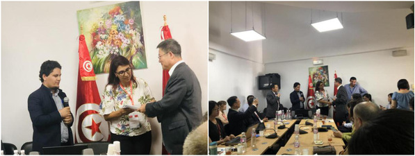 展会期间,刘延平副校长一行赴突尼斯最著名的高校——迦太基大学,参观突尼斯第一所孔子学院,会见突尼斯大学校长Olfa Benouda Sioud 、副校长Riadh Abdelfattah和孔子学院中外方院长并洽谈合作意向。刘延平副校长还代表展团向迦太基大学校长Olfa Benouda Sioud女士赠送了水晶牌。