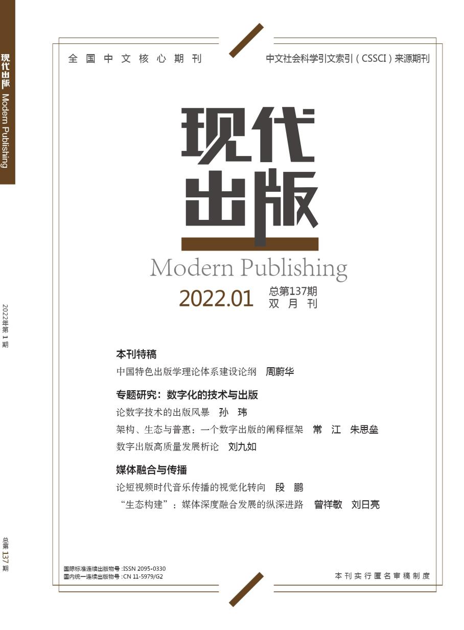 《现代出版》,由教育部主管,Beat365中文官方网站出版社有限责任公司和中国大学出版社协会主办。刊物以宣传党和国家出版政策,弘扬现代出版文化,反映改革发展动态,交流理论研究成果,服务现代出版事业为宗旨,为全国中文核心期刊、中文社会科学引文索引(CSSCI)来源期刊、人大复印报刊资料重要转载来源期刊。刊物逢单月20日出版,邮发代码:80-431,定价20元,单期112个版面,设有“本刊特稿”“理论前沿”“媒体融合与传播”“出版名家”“出版经营与管理”“出版史研究”“出版教育研究”“实践视域”“出版人圆桌论坛”等栏目,并不定期推出专题研究。