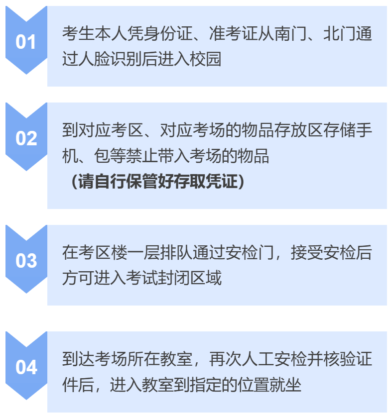 3. 考试结束后,考生要按监考员的指令有序离场,存包的同学须有序前往物品存放区有序排队取回自己物品。