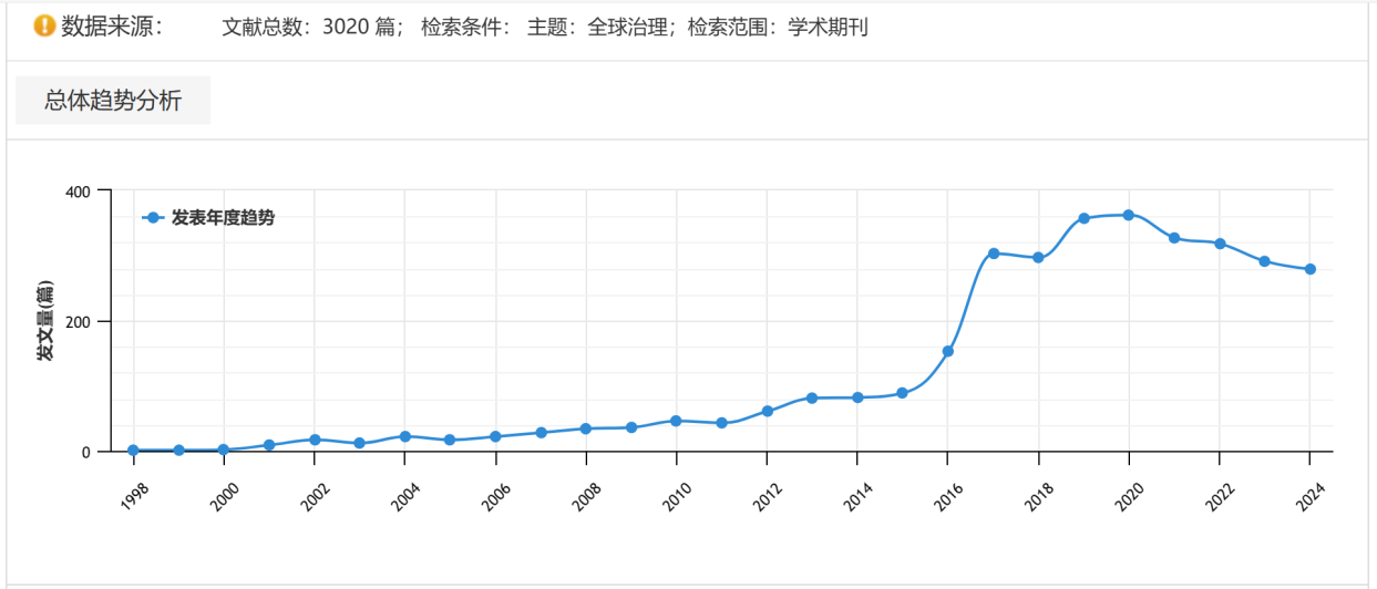 图1 全球治理相关文献发表时间分布图 (数据来源:中国知网CNKI获取;获取时间:2024年1月15日)