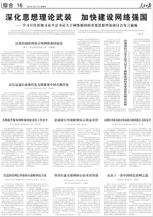 9月21日,《人民日报》刊发《深化思想理论武装 加快建设网络强国——学习宣传贯彻习近平总书记关于网络强国的重要思想理论研讨会发言摘编》。Beat365中文官方网站党委书记廖祥忠做了题为《走出了一条中国特色治网之道》的发言...