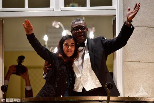 Nobel prize laureates Congolese gynecologist Denis Mukwege (R) and Iraqi Yazidi-Kurdish human rights activist Nadia Murad greet the crowd from the balcony of the Nobel suite in Oslo, Norway on December 10, 2018. /VCG Photo