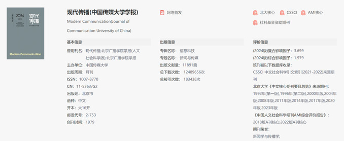 截至2024年,《现代传播》总引用次数超过18万次,总下载量超过1200万次,在全国学术期刊中名列前茅。