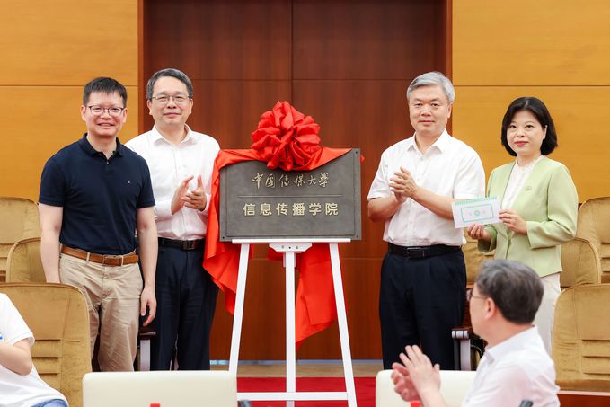 廖祥忠、张树庭、周勇、李舒为信息传播学院揭牌。