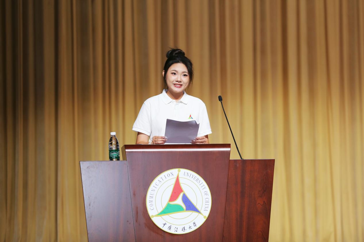 国际预科学生会主席苏洢琳作为学员代表发言。她结合自身经历,分享了“从迷茫到笃定”的成长历程,表示预科阶段是多元文化交融和人格独立发展的重要阶段,系统的课程、丰富的活动,可以真实触摸到传媒的脉搏,为海外学习打下坚实基础。她提醒学弟学妹,积极参与校园活动,主动利用学校资源,拓展视野、结识挚友,从中传出发,向世界报到。