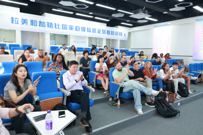 拉美和加勒比国家自媒体意见领袖在课堂上认真聆听课程讲授,聚焦中国文化传播路径与短视频创意表达。