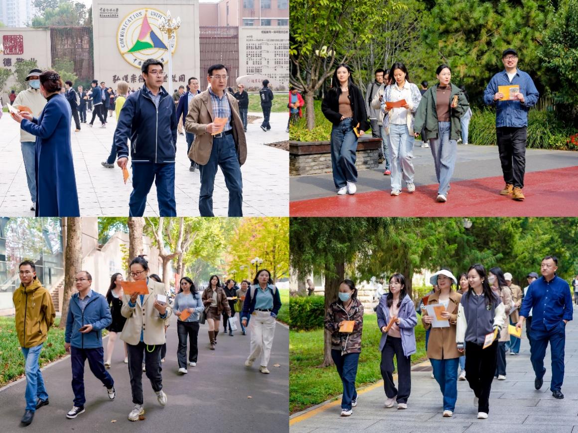 广大教职工齐聚中传文化广场,精神抖擞、热情高涨,按照既定路线,老师们踏着轻快的步伐一路沿红枫大道、海棠大道、樱花大道、梧桐大道而行,途经艺术与传播大楼、阳明书院、梧桐书屋、轮滑广场、白杨大集、图书馆、博物馆、传旗林、中传学术中心、核桃林等多个标志性建筑和场所。老师们三三两两结伴前行,与草木流金、橙黄橘绿的校园秋景相映成趣,形成了一道美丽的风景线。