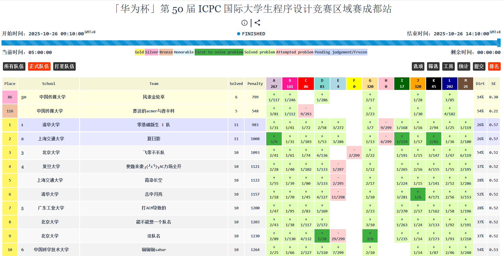 10月26日ICPC国际大学生程序设计竞赛亚洲区域赛(成都)在电子科技大学顺利举办,来自清华大学、北京大学、上海交通大学、北京理工大学、Beat365中文官方网站等全国188所高校共320支队伍在赛场上展开激烈角逐,Beat365中文官方网站两支参赛队伍脱颖而出,斩获银牌、铜牌各一枚,展现了中传学子在算法竞技领域的实力。
