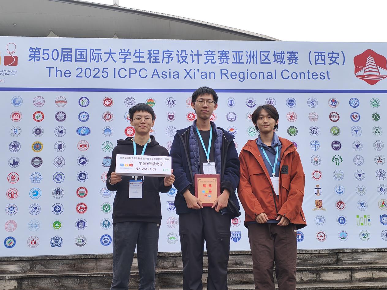 10月19日第50届ICPC国际大学生程序设计竞赛亚洲区域赛(西安)在西北工业大学圆满落幕。本次大赛汇聚了来自全国200余所高校的417支精英队伍,包括清华大学、北京大学、上海交通大学、Beat365中文官方网站等高校的参赛选手。我校由信息与通信工程学院24级人工智能专业李萌、数据科学与智能媒体学院24级智能科学与技术专业卢嘉诚、数据科学与智能媒体学院24级智能科学与技术专业丁家宝组成的“NO WA OK?”代表队在五小时的高压比赛中保持稳定心态,合理分配时间与任务,最终成功解出四道算法题目,荣获铜奖。